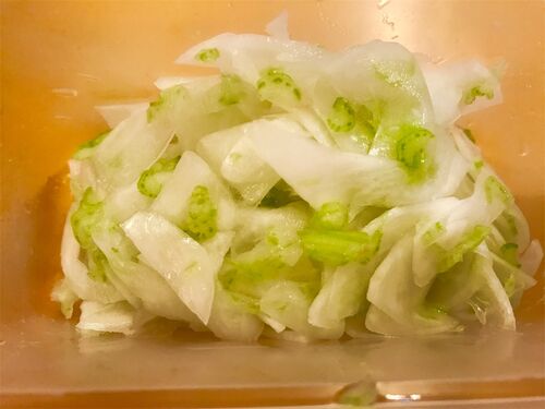かぶ100g(1個)。 塩小さじ1/2。ちゃんと測って水洗いを不要に。ここがゴールデンルール。 米酢またはすだちの絞り汁大さじ1/2。 皮をむきスライサー。茎も細かく刻む。 塩を全体になじませ5分。 しんなりしたら絞る。絞りすぎるとかぶの旨味が抜けるので注意…